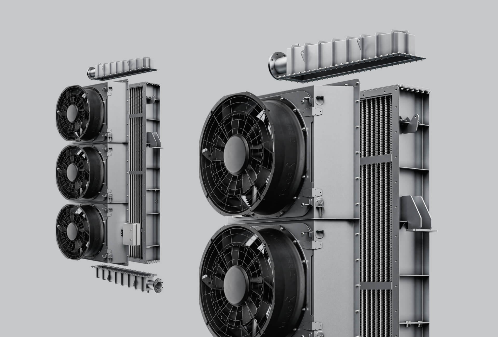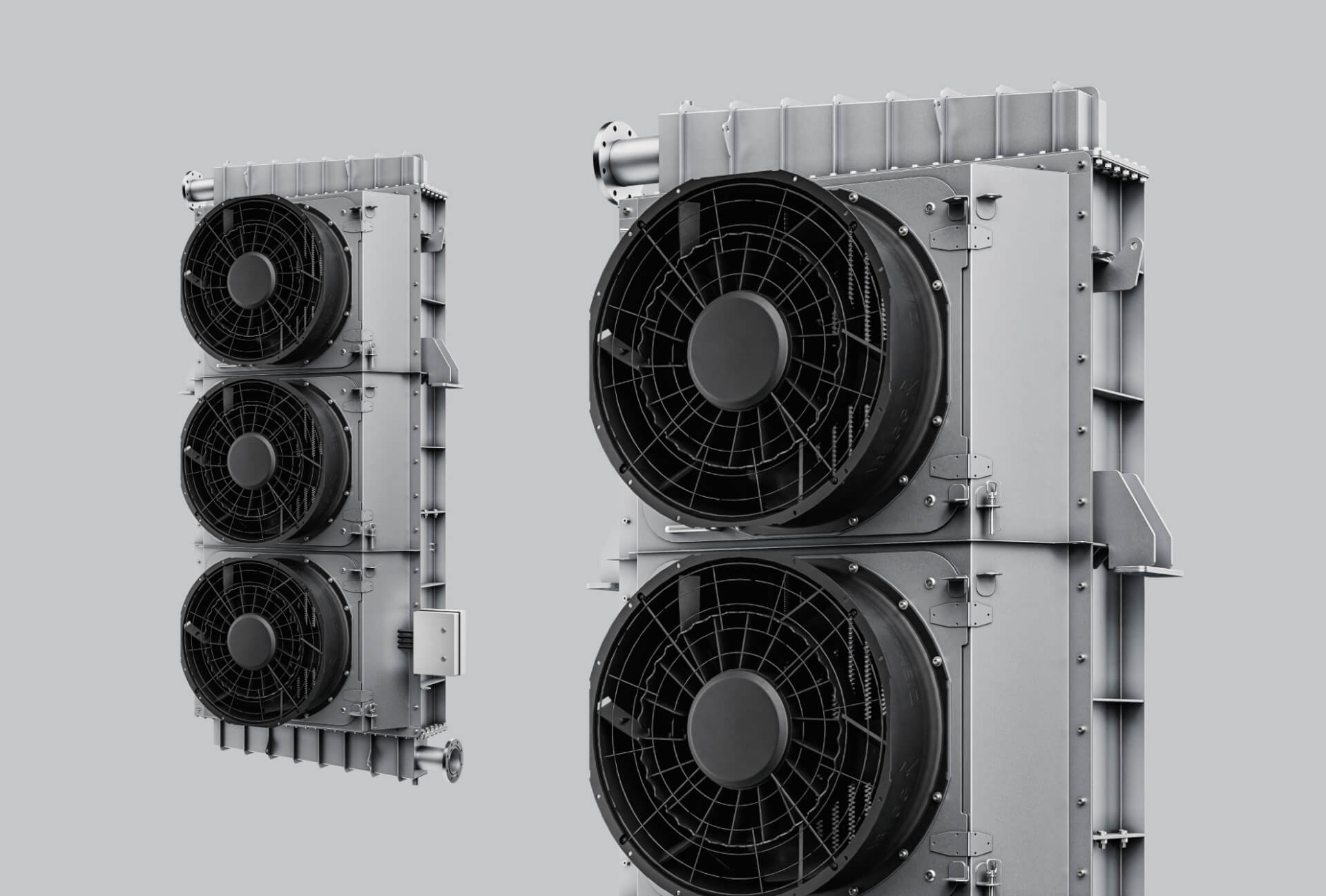 The project required the design and supply of modular, high-efficiency heat exchangers capable of ensuring reliable, stable cooling of transformer oil under demanding operating conditions. The equipment had to operate within a wide temperature range from –40°C to 95°C, while also maintaining low noise levels to comply with strict acoustic requirements. A significant challenge was the need to integrate the solution into the customer’s limited installation space, which required a compact yet highly efficient design. In addition, the heat exchangers had to deliver long-term durability and excellent corrosion resistance, as they were intended for continuous operation in harsh outdoor conditions. These combined requirements defined a complex technical challenge and demanded a carefully engineered, precisely tailored cooling solution. At the same time, the customer expected easy access for inspection and servicing, to minimise maintenance time and keep the system running smoothly. Meeting all constraints in one compact package required an optimised balance between thermal performance, acoustics, structural robustness and lifecycle reliability.
